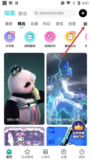 在壁纸首页点击右上角的分类图标,即可展开全部分类页面。