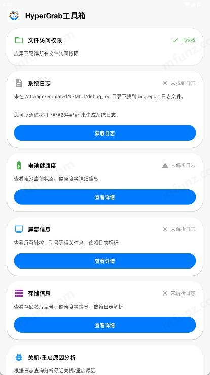 hypergrab安卓版包含文件访问权限、系统日志、电池健康度、屏幕信息和存储信息等功能,点击就能根据自身需求开启,为你带来更个性化的手机操作体验!