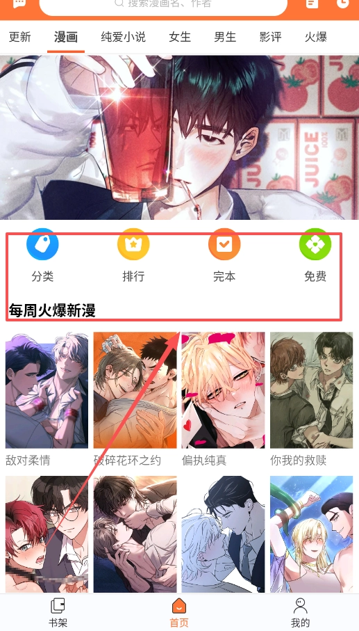 登录成功进入首页后,页面上方设有更新、漫画、纯爱小说等分类标签,中间区域展示着每周热门新漫的推荐内容,你可以在此浏览并发现各类漫画作品。