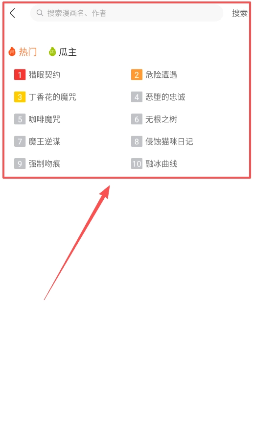 要是想查找特定的漫画,你可以点击顶部的搜索框,输入漫画名称或者作者的名字来进行搜索,搜索框下方还会展示热门搜索榜单。