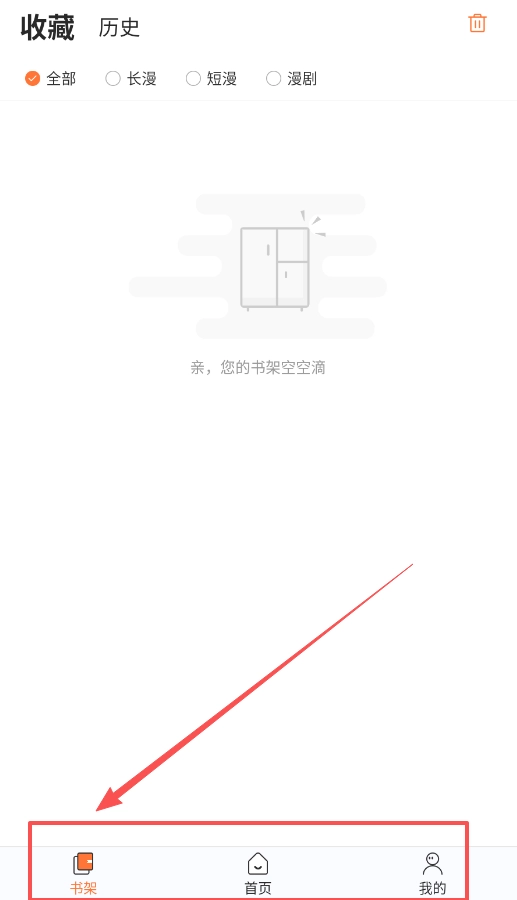 若想查看个人收藏与阅读历史,可点击底部导航栏的“我的”选项。进入该页面后,便能找到收藏内容和历史记录,接着就可以将喜爱的漫画添加至书架,以便后续追更。