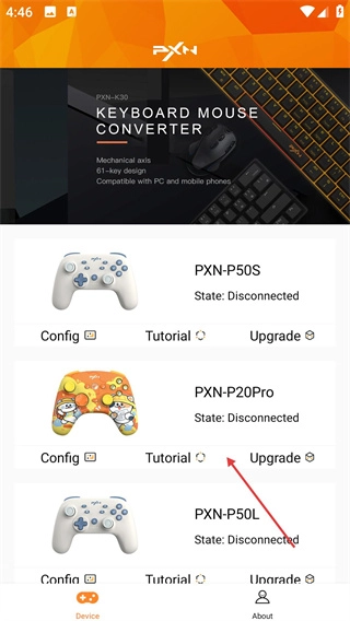 进入【Device】页面后,能够查看【PXN-P50S】、【PXN-P20Pro】等设备的状态,并且可以借助【Config】、【Tutorial】、【Upgrade】这些功能对设备进行操作。