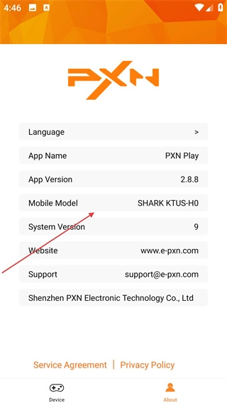 切换至【About】页面,即可查看【App-Name】为【PXN-Play】、【App-Version】为2.8.8,同时也能获取【Website】等相关信息。