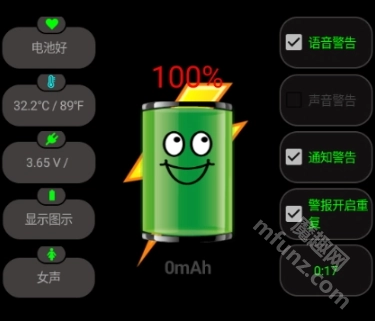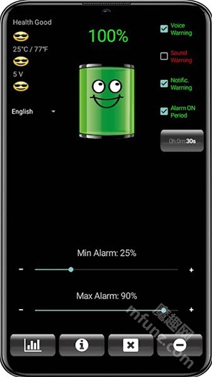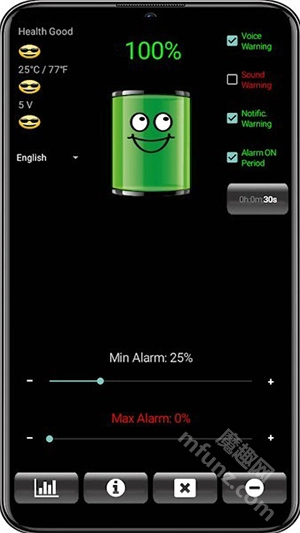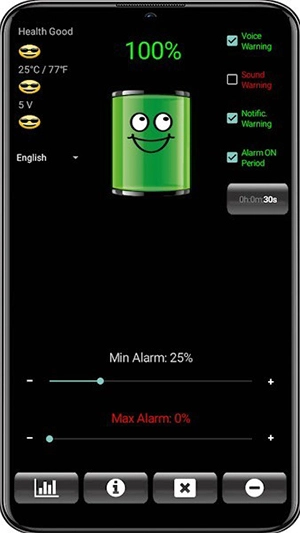 Battery Alarm PRO的中文名称是电池警报器,这是一款能够实时监控手机电池状态的电池管理工具。打开BatteryAlarmPRO的首页后,系统会自动检测手机的电池信息,像剩余电量、电压、电池温度等数据都会呈现出来。用户可以根据自身需求,选择设置语音警告、通知警告等不同的提醒模式,并且还能手动调整电池警报的最小和最大值。