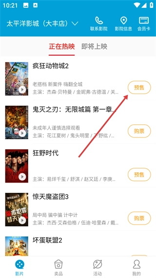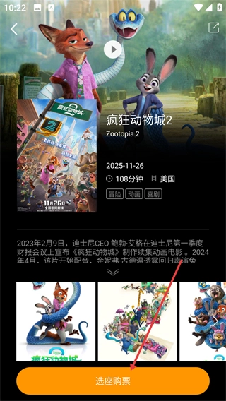 点击你喜欢的电影(比如《疯狂动物城2》)对应的【预售】或者【购票】按钮,就能进入该电影的详情页面。
