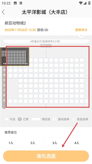 在选择场次的页面挑选你喜欢的场次,点击【购票】按钮,就能进入选座界面。