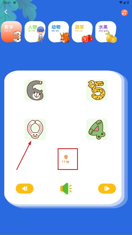 在数字学习界面中,你可以通过点击数字图标来学习数字,例如点击兔子造型的数字图标就能学习“零-líng”。