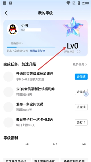 你可以在我的等级页面查看自己的等级(比如Lv0)、升级的进度情况,还有与之相关的任务和福利。