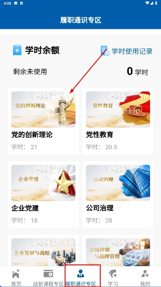 进入【履职通识专区】页面,挑选“党的创新理论”等目标课程开展学习。