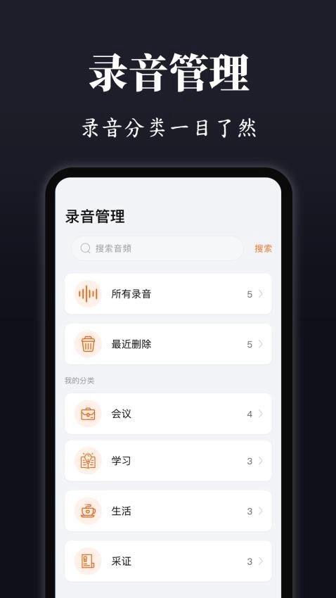 软件允许用户对录音进行自定义分类管理,助力打造专属的个性空间。