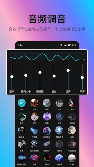 提供全面音频调音功能可为音频添加声卡混响等几十种音效选项,用户可根据需求灵活调整效果,实现个性化声音处理增强表现力。