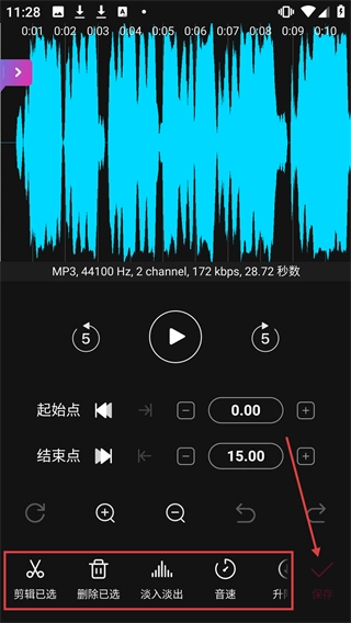 在音频剪辑界面,你可以借助下方的工具来辅助完成剪辑操作,等剪辑结束后,点击【保存】按钮即可。