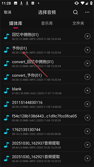 在音频选择页面,点击需要剪辑的音频文件(比如“予你(01)”),即可进入音频剪辑界面。
