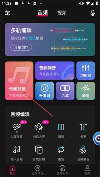 在音频编辑软件的首页,找到并点击【音频剪辑】选项,即可进入选择音频的页面。
