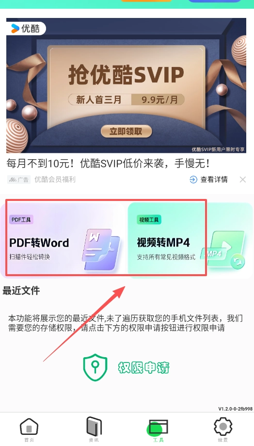 工具页面里藏着不少实用功能,文件管理可以对视频、图片进行分类整理,还有PDF转Word、视频转MP4这类便捷的小工具。