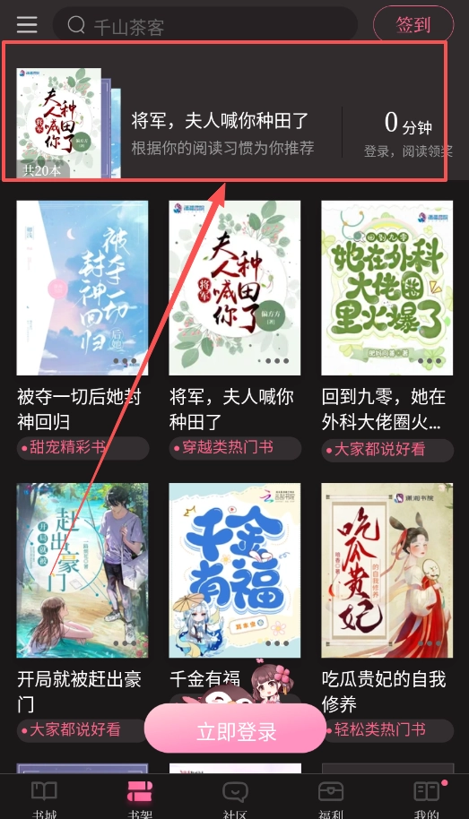 首页的推荐板块是智能找书的入口,这里会为你推荐《将军,夫人喊你种田了》这类热门作品,每本书籍都标注着穿越、甜宠等清晰的标签。