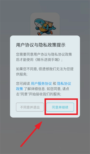 安装并启动鲸乐送应用,在弹出的用户协议与隐私政策提示页面,点击“同意并继续”按钮。