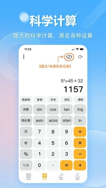 科学计算器模块具备三角函数、指数对数、根号运算等复杂计算功能,可适配学生学习、工程计算等专业场景。