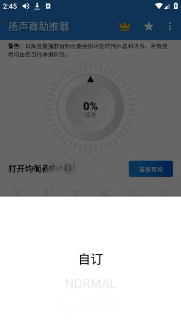 扬声器助推器最新版,扬声器助推器的最新版本是一款能让手机音量增大或实现其他不同效果的辅助软件。软件里的音量参数支持自由调整,但需要注意的是,过大的音量可能会对听力造成不良影响。该软件的界面设计简洁直观,各项功能清晰明了,只需简单操作即可使用,同时还提供了详细的设置选项供用户自定义。