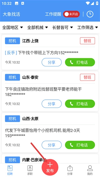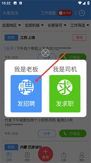 覆盖各类工程机械,机主可自行发布作业信息,司机能精准对接替班或长期工作,双向满足招工与求职需求,服务场景全方位适配。