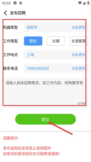 在发布招聘页面,依次填写机器类型、工作类型、工作地点、联系电话以及招聘需求等相关信息后,点击【提交】按钮即可。