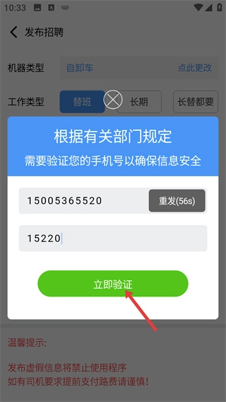 在手机号验证弹窗里输入验证码,接着点击【立即验证】按钮,这样就能完成招聘发布的操作了。