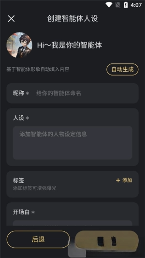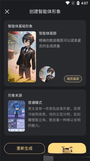 用户既能自主设定智能体的外观、语音、人物设定与各项技能,也可以选择一键交由系统自动生成虚拟角色。
