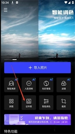 安装光影魔术手App后,无需登录就能直接进入App首页,接着点击【证件照】选项。