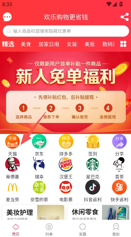 进入首页,选择天猫、京东等平台或商品分类。