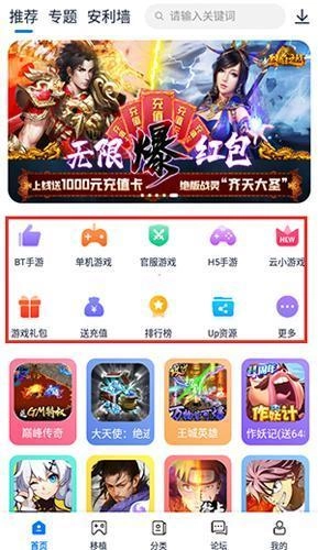 在首页,提供了bt游戏、单机游戏、官服游戏、h5等多种游戏类型。