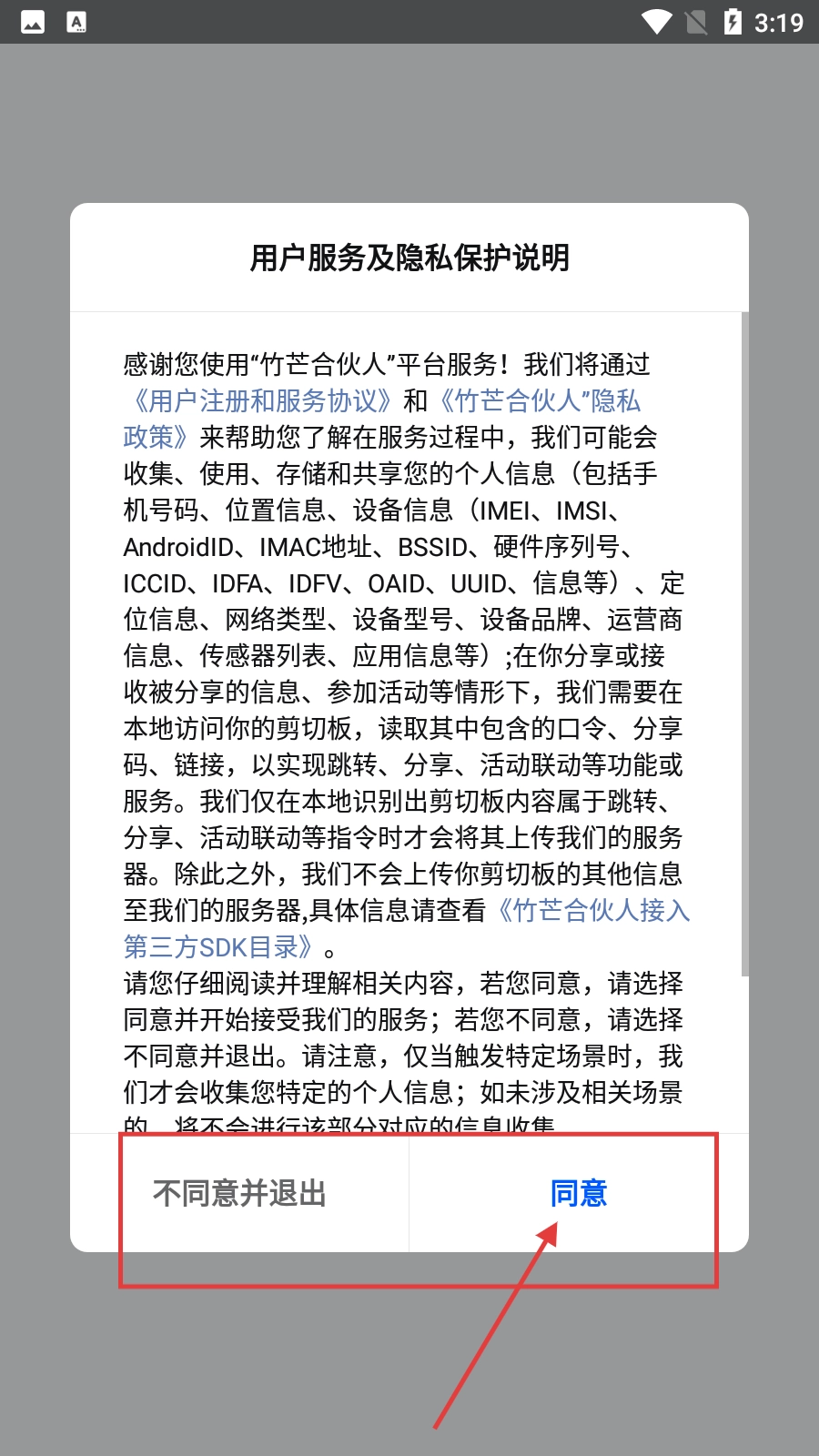 首次使用竹芒合伙人平台时,您可以点击“同意”按钮来开启服务使用流程,也可以选择“不同意并退出”选项。