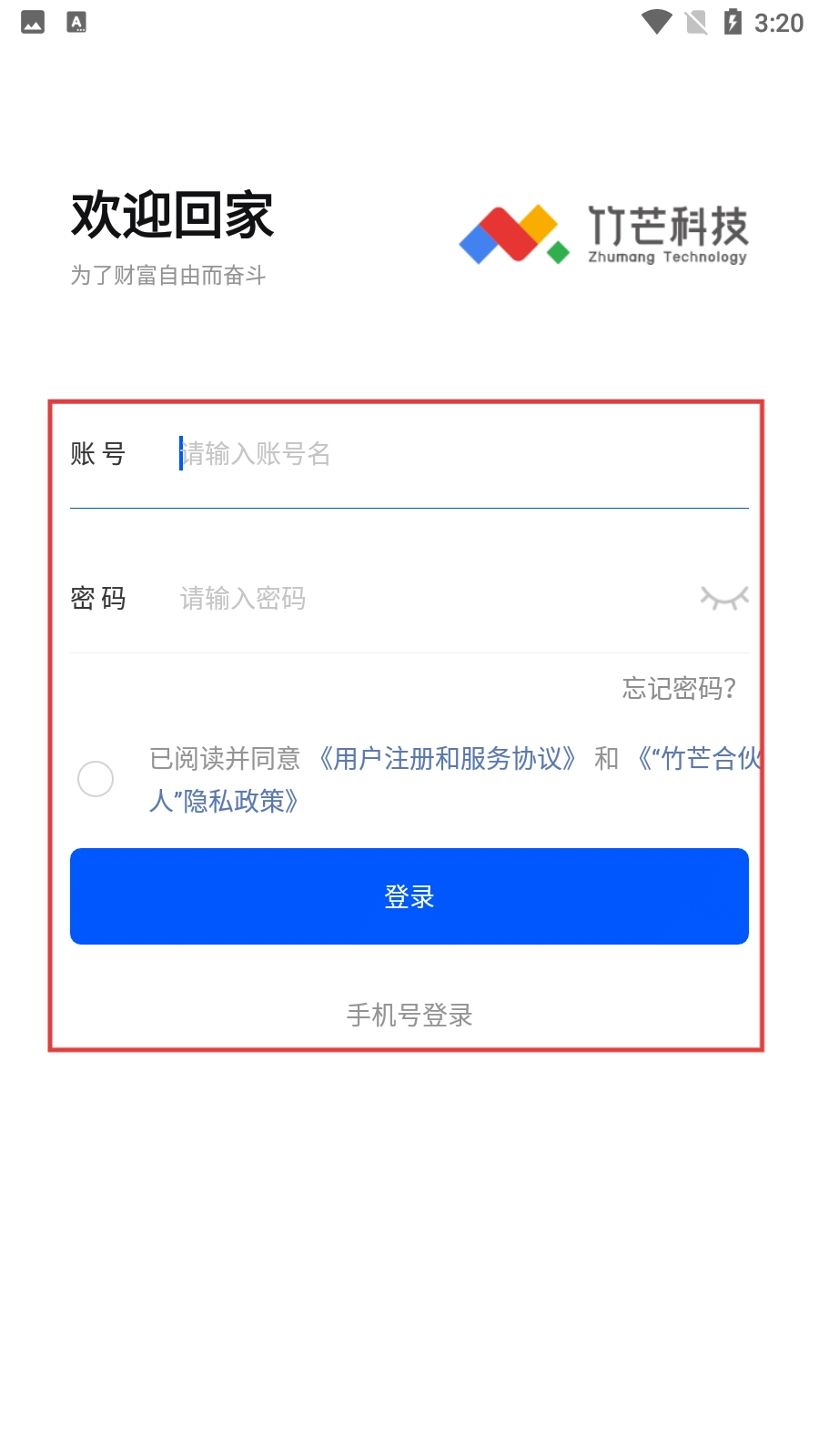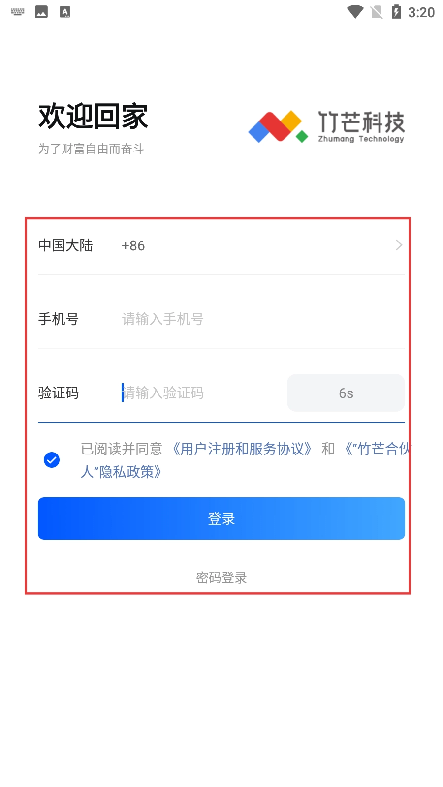 登录界面设有手机号验证码登录与账号密码登录两种选项,若选择手机号登录方式,则需先输入手机号,再获取并填写验证码。