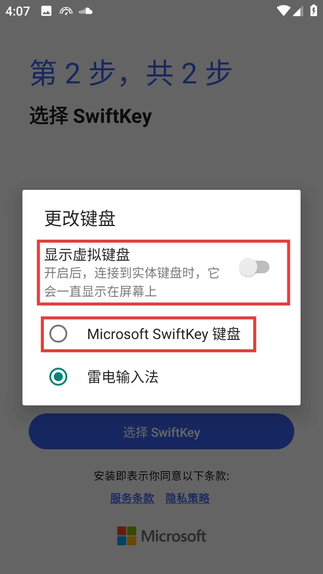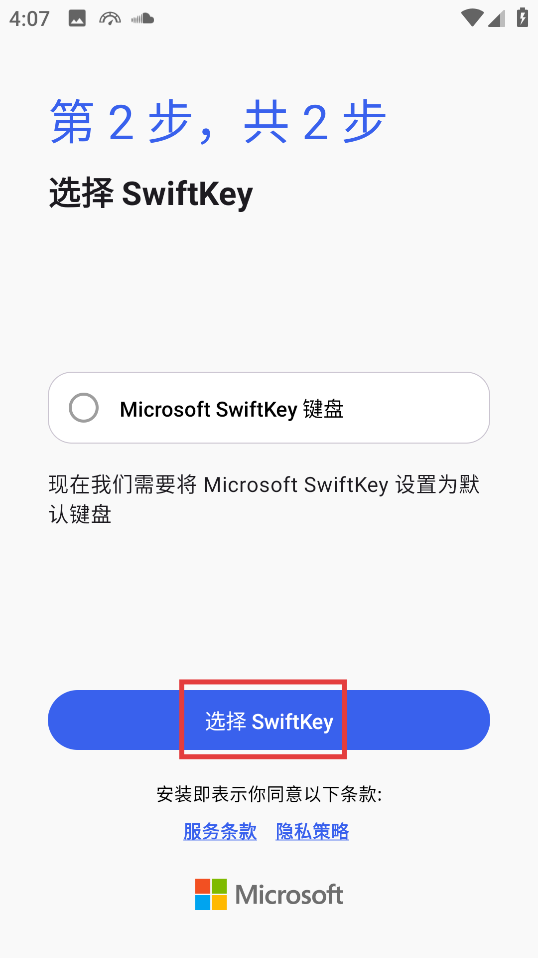 在键盘选择页面中,选择【MicrosoftSwiftKey键盘】,并完成默认键盘的设置。