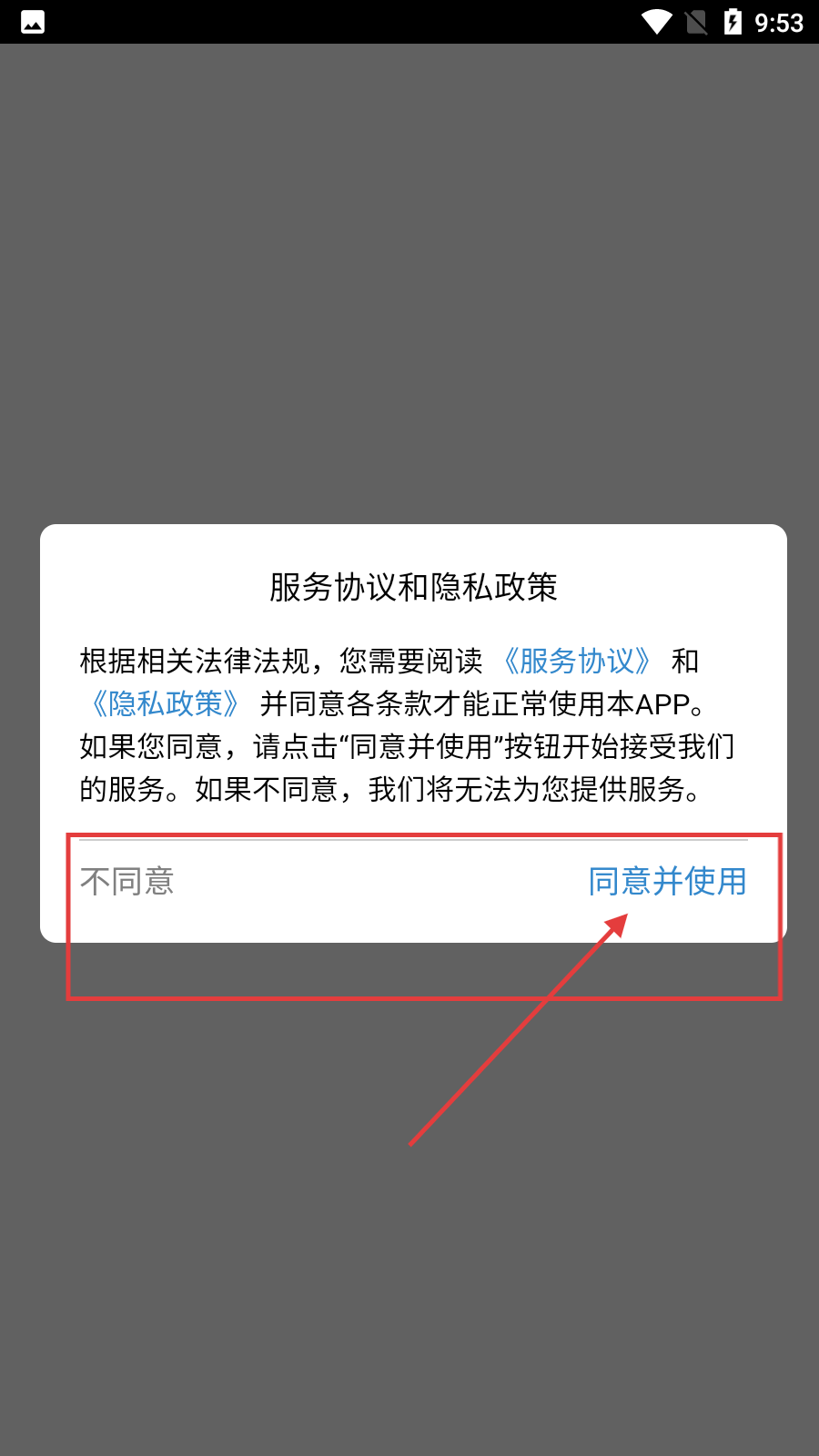 首先点击【同意并使用】按钮,以此接受服务协议与隐私政策,随后即可进入诗词吾爱首页。