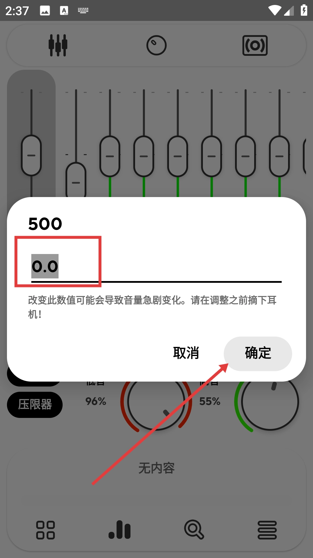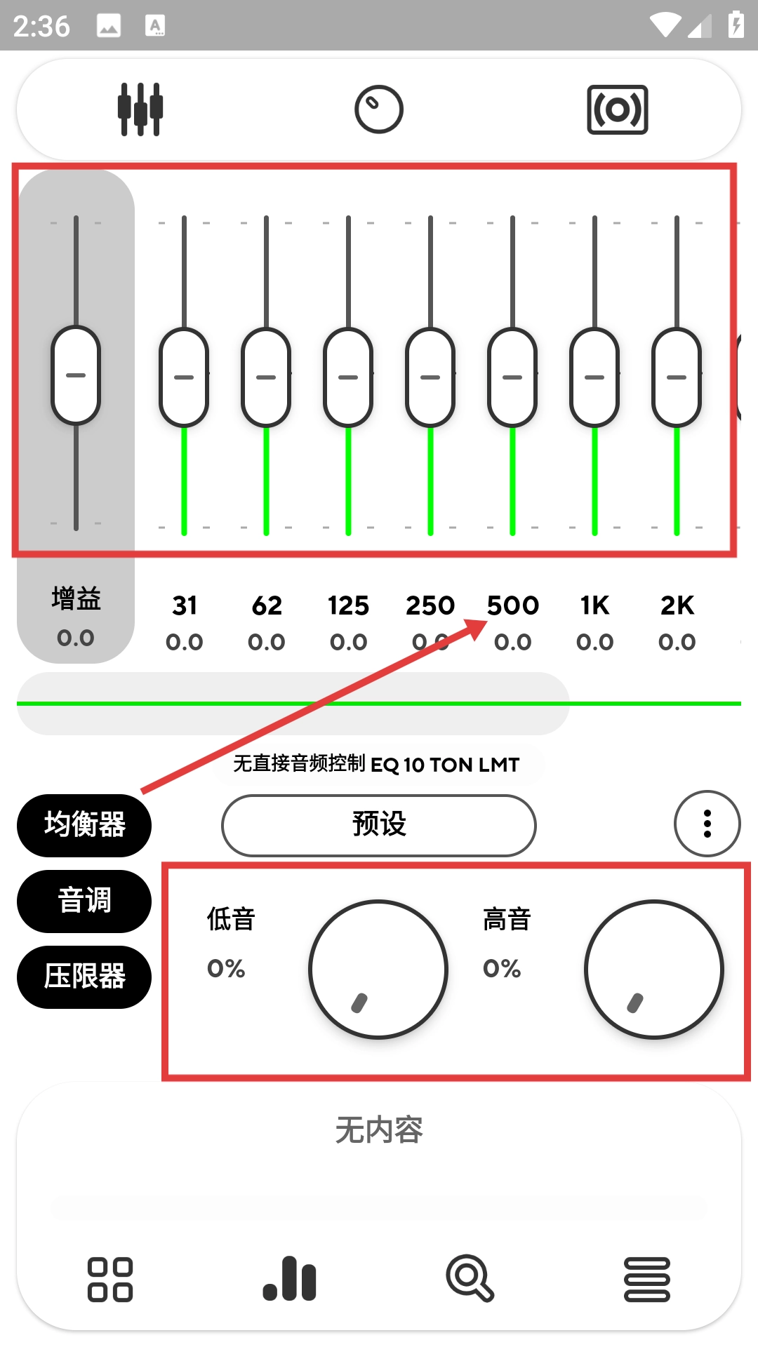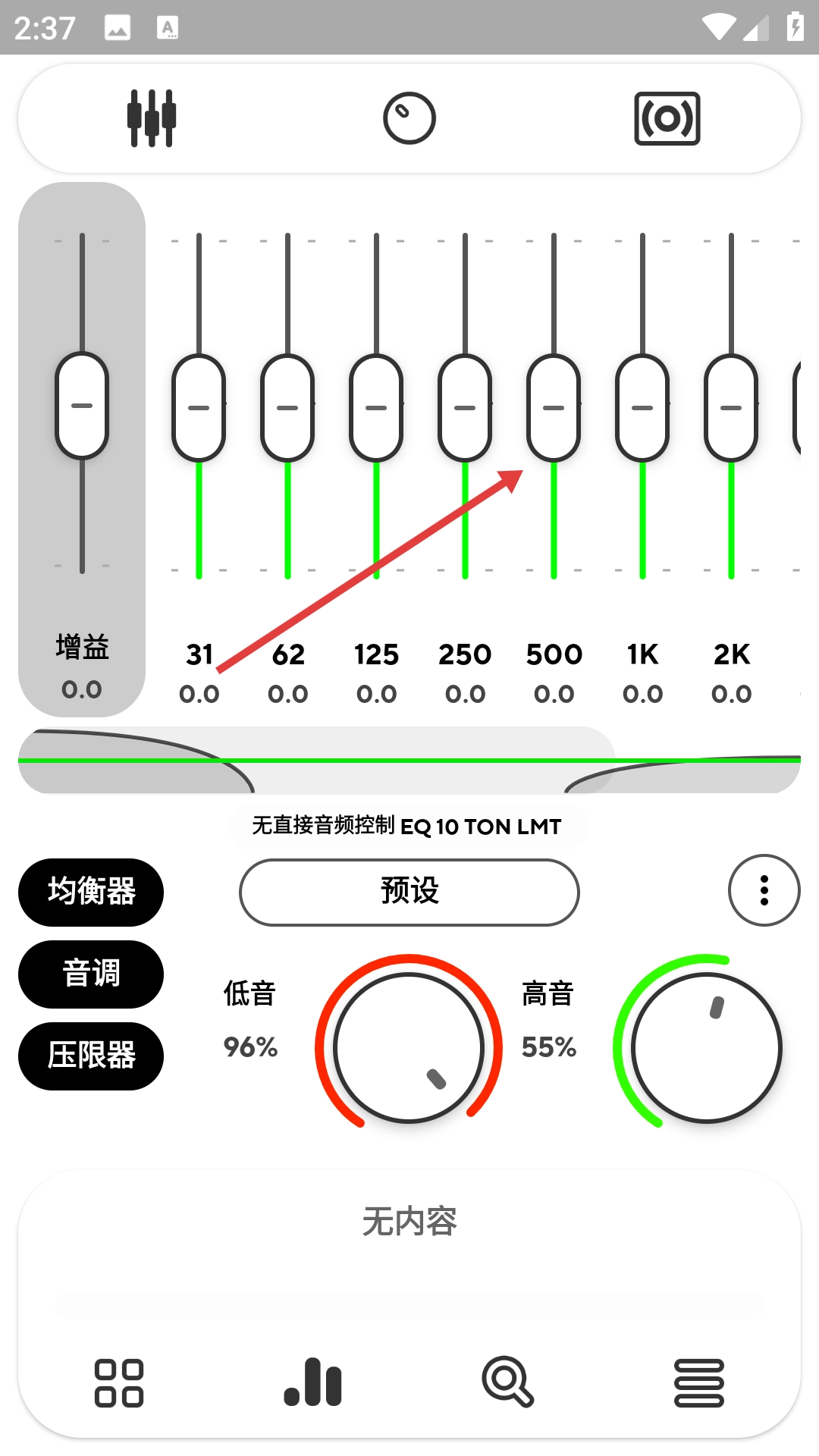 在音频均衡器的设置界面中,能够对不同频段的增益进行调节,例如500频段。