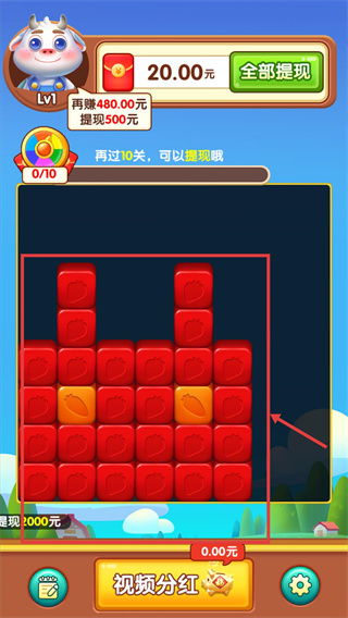 按照提示点击颜色相同的方块,比如【橙色-胡萝卜】方块,点击之后就能消除方块并得到红包。
