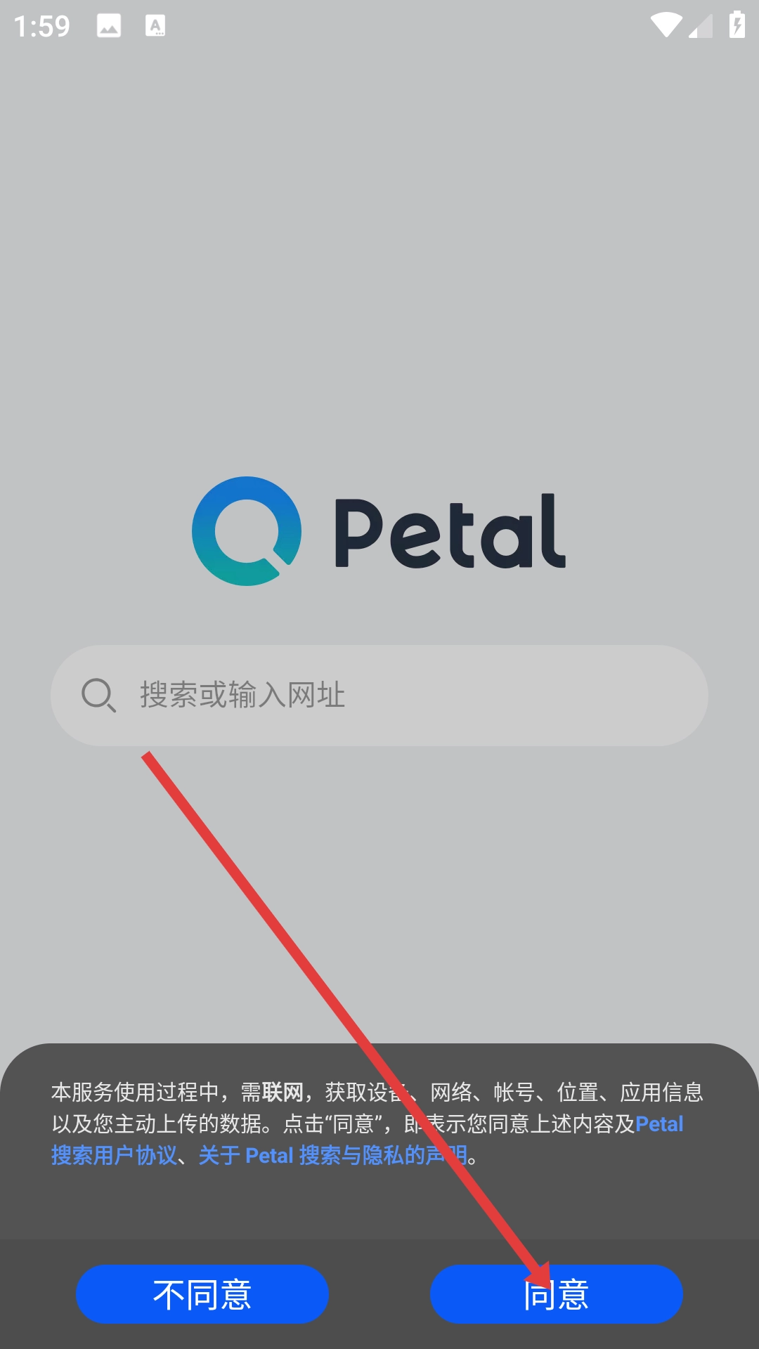 在Petal软件弹出的服务协议窗口里,点击【同意】按钮,这样就能授权它获取相关数据,进而继续使用该服务。