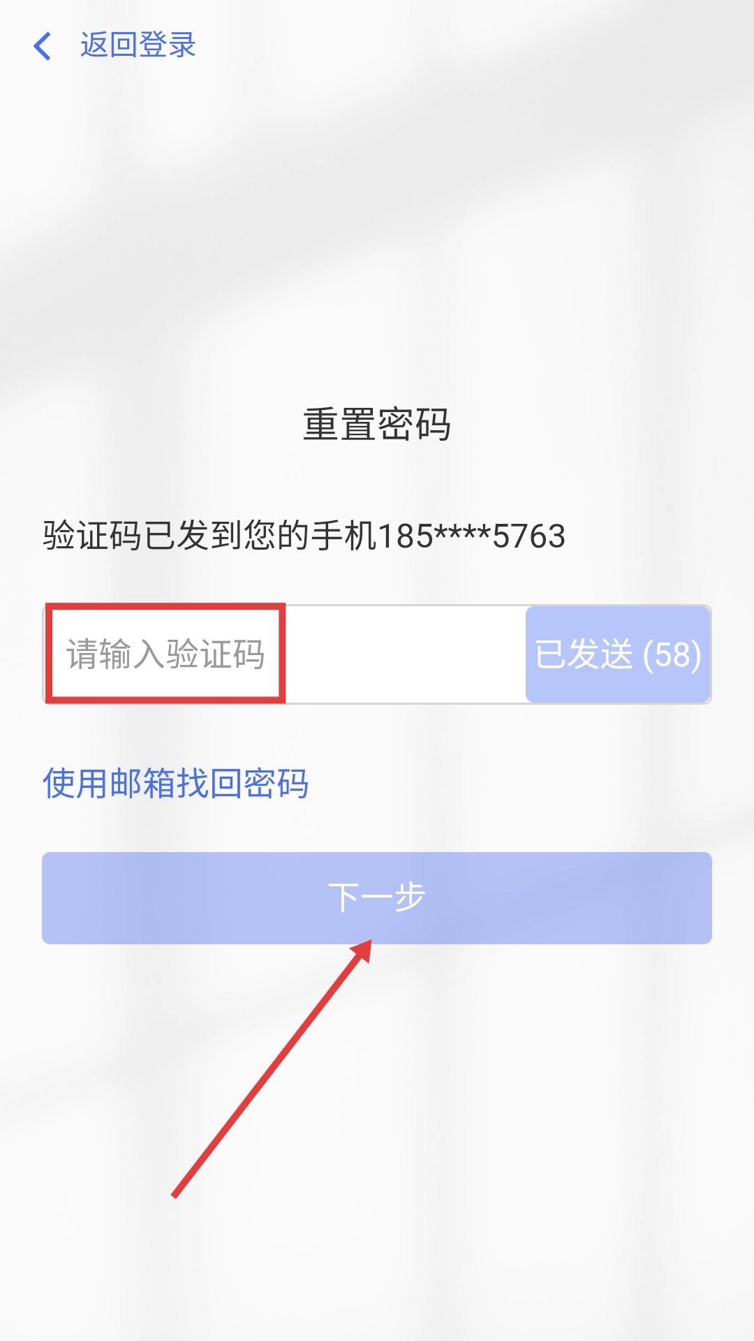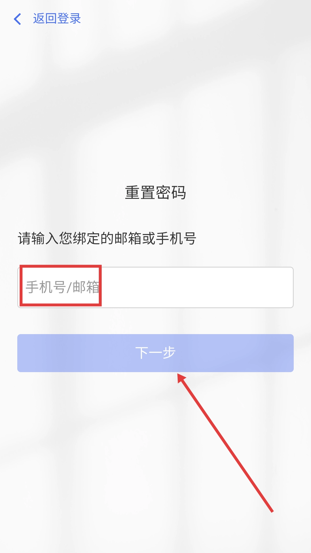 在重置密码的页面中,输入已绑定的手机号或者邮箱地址,接着点击【下一步】按钮。