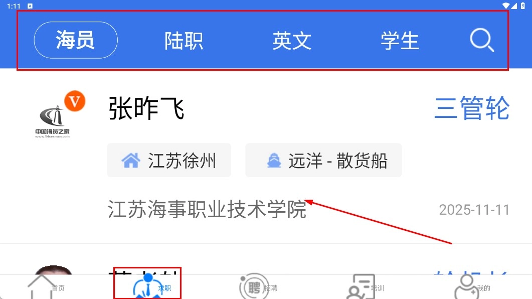 点击底部的【求职】功能按钮,接着选择【海员】分类标签,就能查看与之相关的求职信息了。