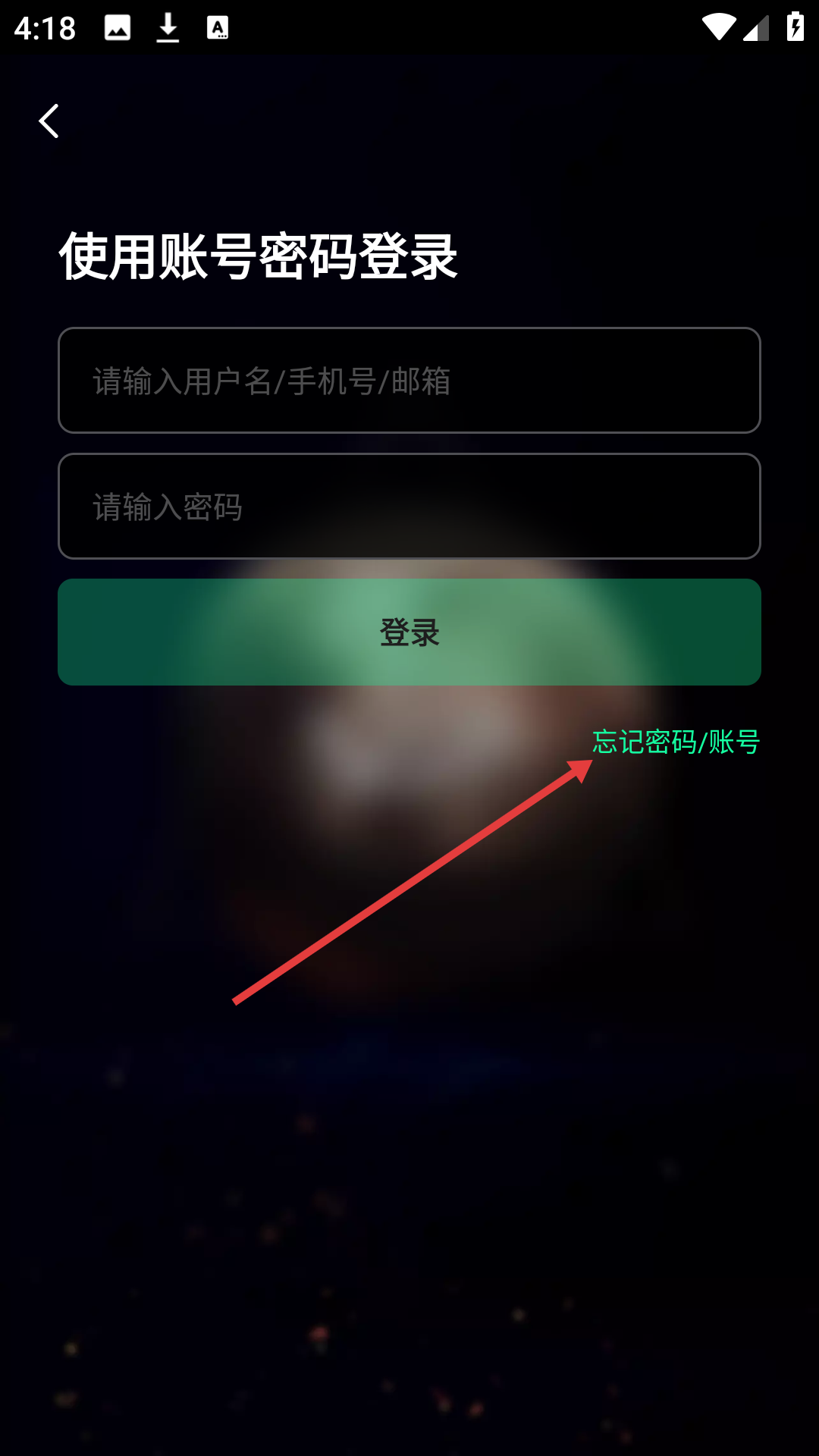 在账号密码登录页面,点击“忘记密码/账号”选项,即可进入忘记密码页面。