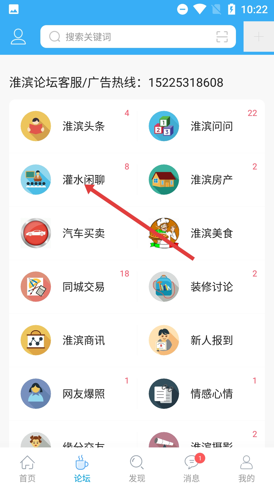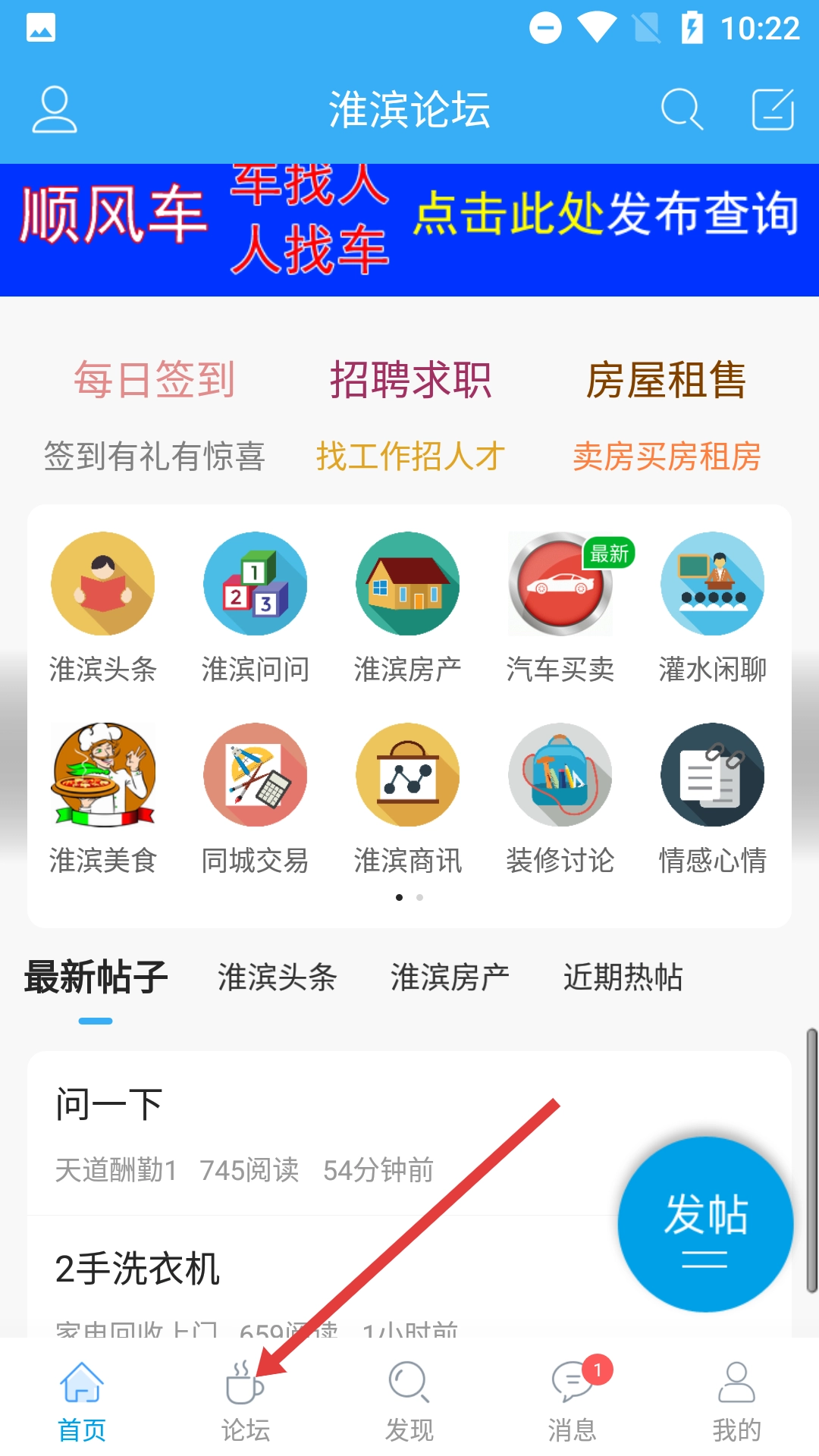 进入淮滨论坛首页后,点击页面底部的【论坛】选项,就能进入论坛板块浏览各类话题分类了。