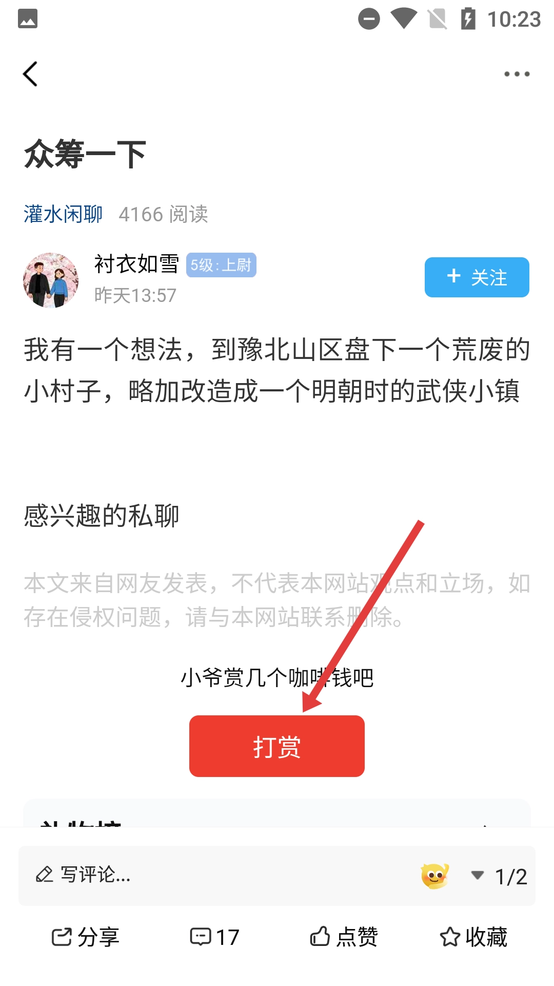 在帖子详情页面,如果想要支持发帖人,你可以点击【打赏】按钮来完成打赏,还能通过评论、点赞、收藏等方式与帖子进行互动。