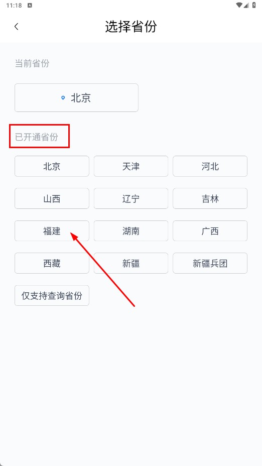 在省份选择页面,点击【福建-已开通省份】选项,即可进入该省份对应的运证通页面。