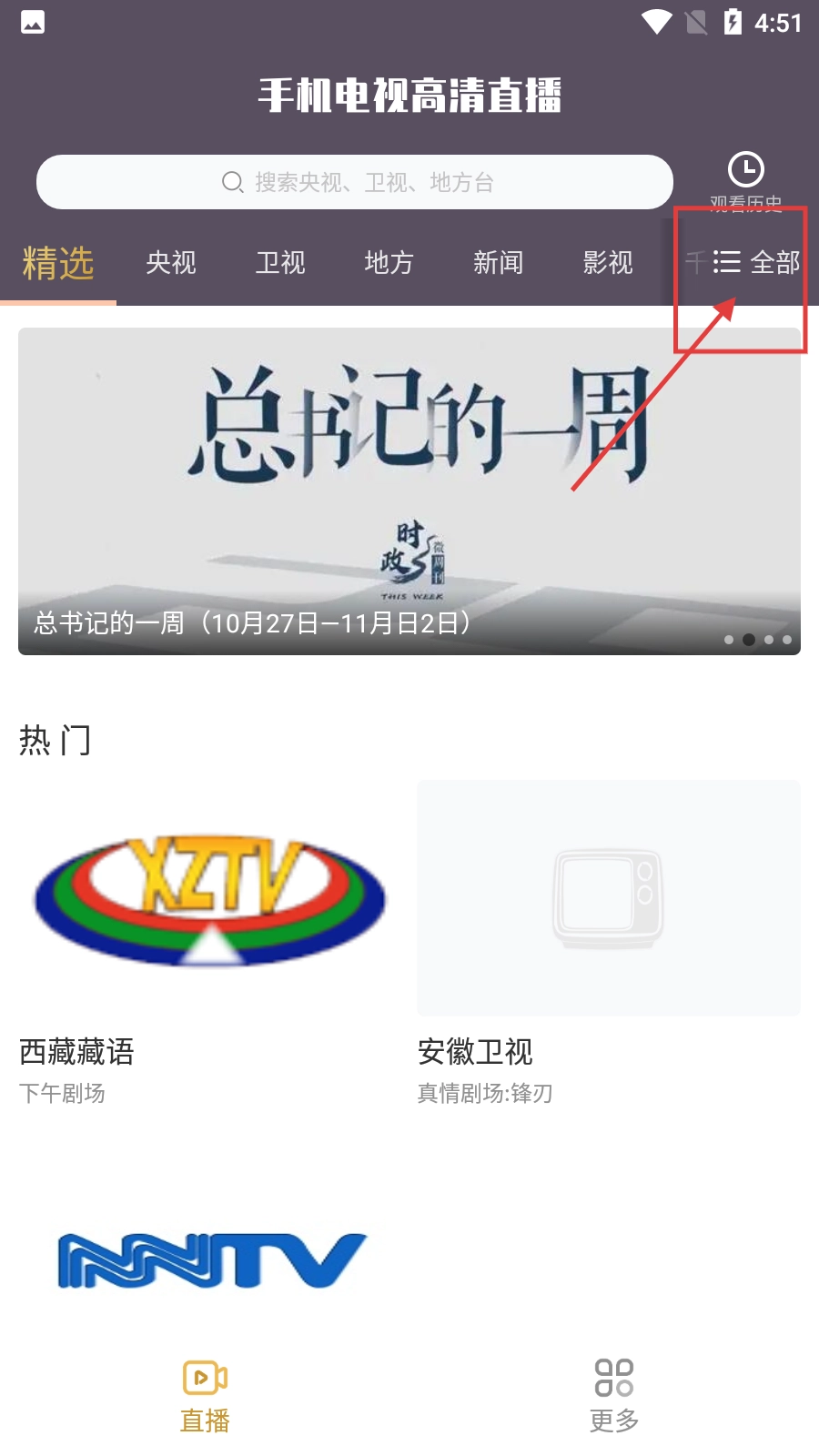 打开手机电视高清直播的主界面后,点击右上角的【全部】按钮,就能展开完整的栏目列表,进而浏览更多的频道分类。
