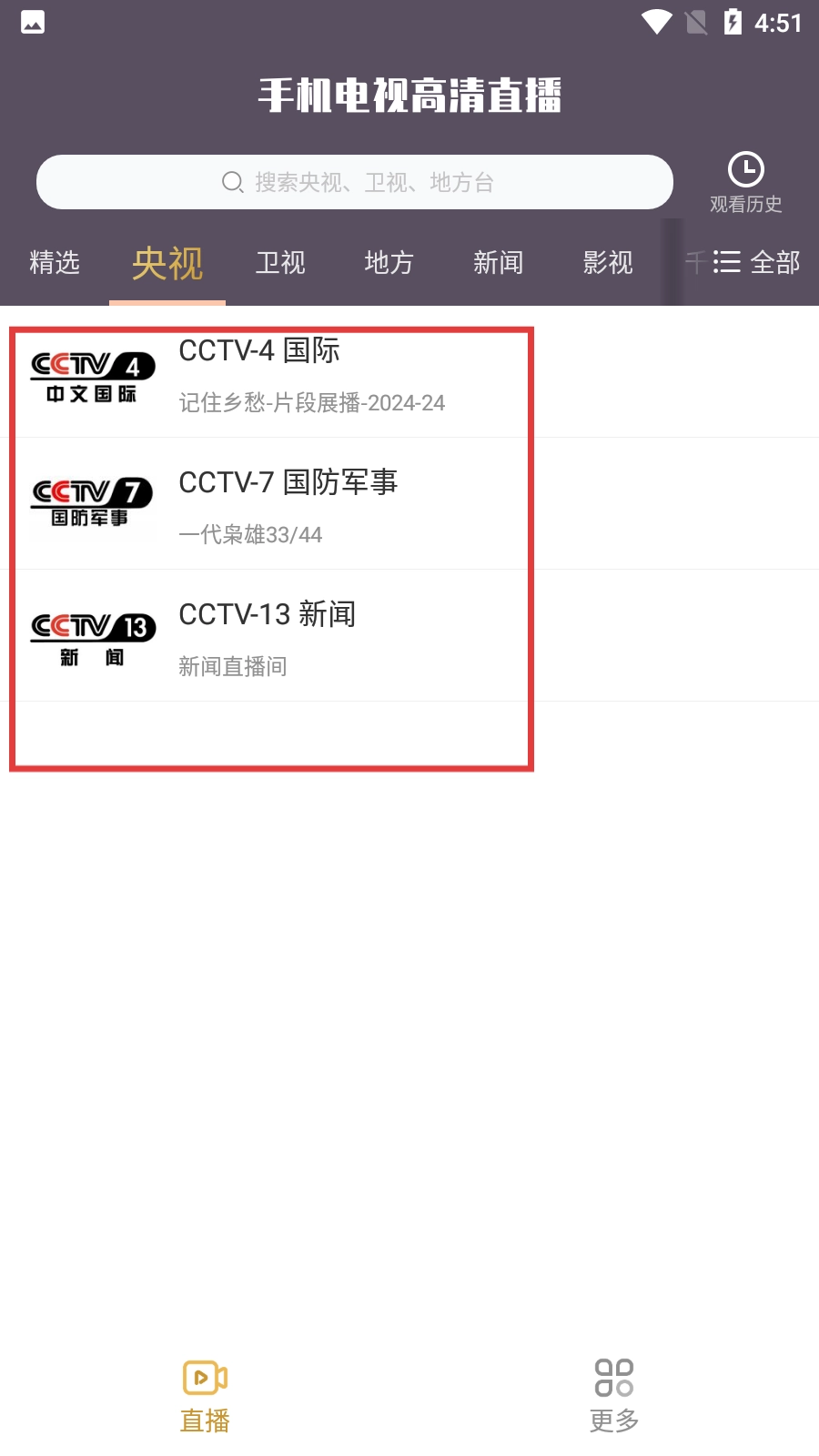 在央视频道列表里,挑选像【CCTV-4国际】这类频道,就能进入该频道的节目列表界面。