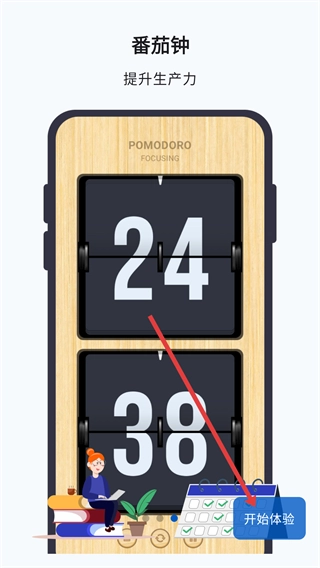 在番茄钟软件的欢迎页面点击【开始体验】按钮,进入软件主界面。