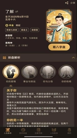 可以在人生剧本页面中查看到你的排盘解析详情内容;