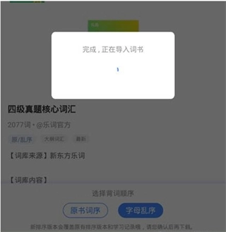 2、随意选择了一个词库,它将弹出背词顺序的选择按钮,你可以在原书词序与字母乱序中进行选择,如下图所示: