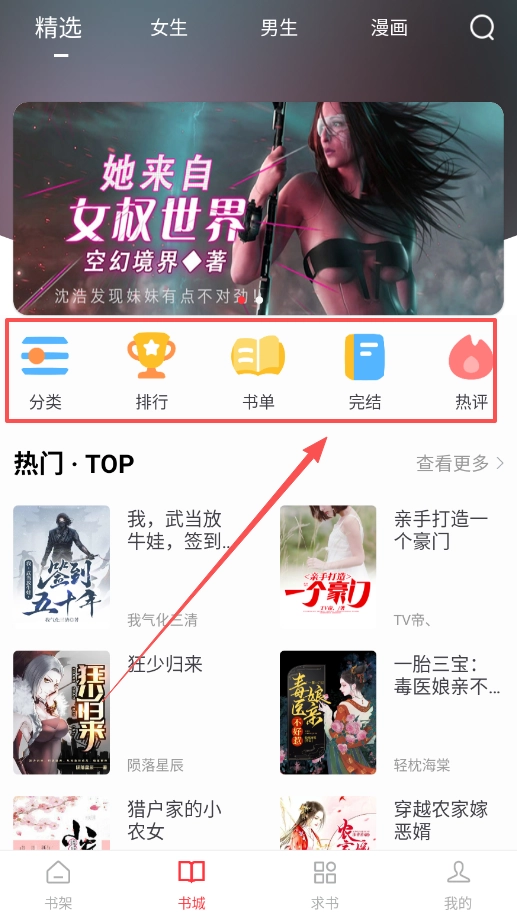 接下来去“书城”转转,能借助“精选”或者“排行”找到热门作品,还能通过精准的标签进行筛选。