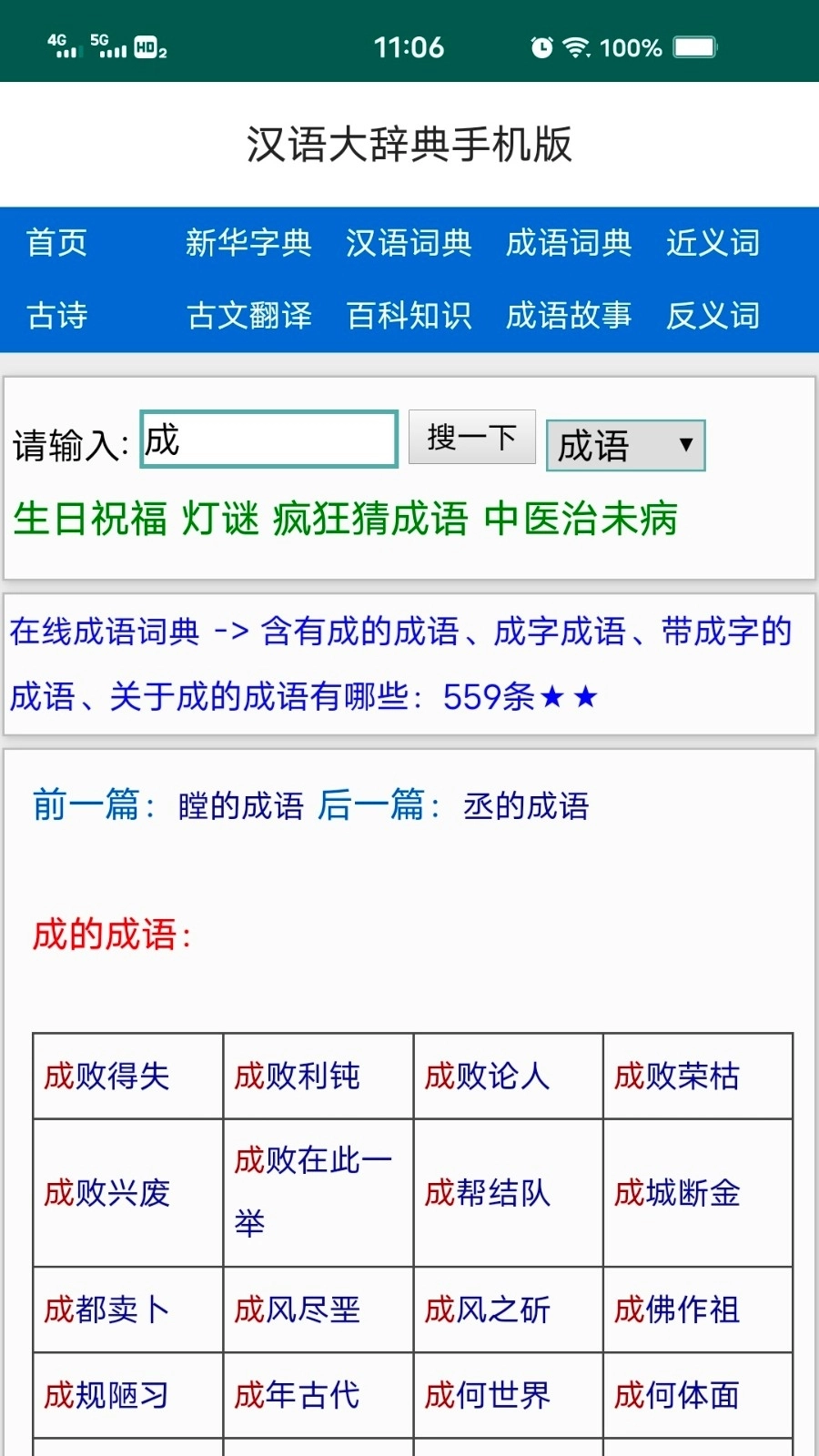 3、再往下便是模糊查询功能,如aab式的词语、abb式的词语、abcc式的词语以及aabc的成语等等,不得不说这点功能的设计,非常适合记忆模糊不清的人使用。